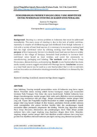 Santoso, Tri Nugroho (2023) Pengembangan produk pangan lokal yang berpotensi untuk penurunan stunting di Kabupaten Pemalang. Jurnal Pengabdian kepada Masyarakat Wahana Usada, 5 (1): 10. pp. 64-69. ISSN 2656-6915