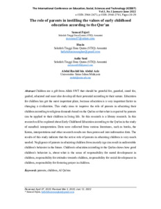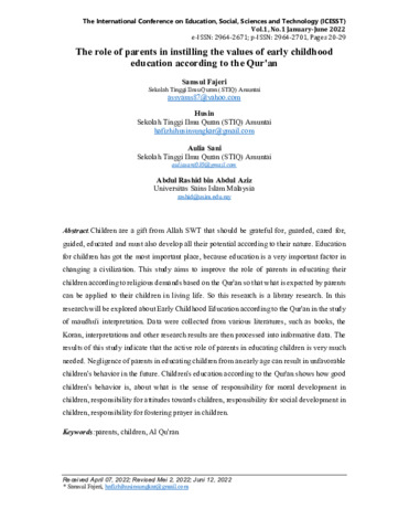 Samsul, Fajeri and Husin, Husin and Aulia, Sani and Abdul, Rashid bin Abdul Aziz (2022) The role of parents in instilling the values of early childhood education according to the Qur'an. The International Conference on Education, Social Sciences and Technology, 1 (1): 3. pp. 20-29. ISSN 2964-2701