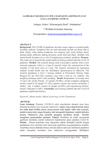 Latar belakang: Pandemi COVID-19 telah memberikan dampak yang besar terhadap kesehatan jiwa termasuk mahasiswa. Gejala yang cukup dominan antara lain tidak dapat berfikir jernih, sering merasa sakit kepala, tidak tidur nyenyak, mudah merasa takut, tangan bergetar, sulit mengambil keputusan, mudah lelah dan lainnya. Mahasiswa yang memiliki gangguan kesehatan mental berisiko mengalami permasalahan akademis Tujuan: Penelitian ini untuk mengetahui gambaran kesehatan mental mahasiswa keperawatan pasca pandemi Covid-19. Metode : Desain penelitian yang digunakan adalah deskriptif analitik dengan pendekatan cross sectional yaitu suatu jenis penelitian yang pengukuran variabel variabelnya hanya dilakukan hanya satu kali dalam suatu saat. Instrumen penelitian untuk mengukur kesehatan jiwa mahasiswa menggunakan Self-Report Questionnaire-20 (SRQ-20). Populasi penelitian yaitu mahasiswa keperawatan tingkat 1 Prodi Keperawatan Purwokerto Tahun akademik 2022/2023 berjumlah 133 mahasiswa. Tehnik sampling yang digunakan yaitu total sampling. Hasil; Responden rata-rata berumur 18 tahun, sebagian besar berjenis kelamin perempuan 117 orang (88,00%), kepemilikan perangkat komputer sebagian besar memiliki yaitu 98 orang (73,70%), pendapatan orang tua sebagian besar berkisar Rp 2 Juta- Rp 4 Juta yaitu sejumlah 65 orang (48,90%) dan mengalami distres yaitu sebanyak 70 orang (52,60%). Simpulan; sebagian besar mahasiswa keperawatan pasca pandemic Covid-19 mengalami distress.