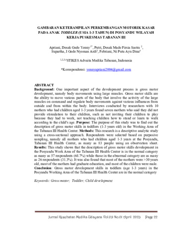 Desak Gede, Yenny Apriani and Desak Made, Firsia Sastra Putri and I Gede, Nyoman Ardi Supartha and Ni Putu, Ayu Dina Febriani (2023) Gambaran keterampilan perkembangan motorik kasar pada anak toddler (usia 1-3 tahun) di Posyandu Wilayah Kerja Puskesmas Tabanan III. Jurnal Kesehatan Medika Udayana, 9 (1): 3. pp. 22-31. ISSN 2460-9293