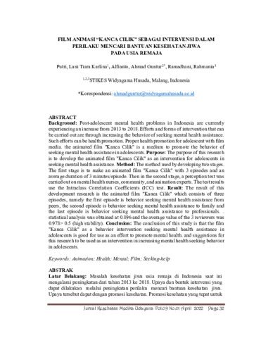 ABSTRAK Latar Belakang: Masalah kesehatan jiwa usia remaja di Indonesia saat ini mengalami peningkatan dari tahun 2013 ke 2018. Upaya dan bentuk intervensi yang dapat dilakukan melalui peningkatan perilaku mencari bantuan kesehatan jiwa. Upaya tersebut dapat dengan promosi kesehatan. Promosi kesehatan yang tepat untuk usia remaja dengan media film. Film animasi “Kanca Cilik” merupakan media untuk mempromosikan perilaku mencari bantuan kesehatan jiwa pada remaja. Tujuan: Tujuan dari penelitian ini adalah untuk mengembangkan film animasi “kanca Cilik” sebagai intervensi pada remaja dalam berperilaku mencari bantuan kesehatan jiwa. Metode: Metode yang digunakan dengan mengembangkan dua tahapan. Tahap pertama adalah membuat film animasi “Kanca Cilik” dengan jumlah episode dan durasi rata-rata 3 menit/episode. Kemudian tahap kedua dilakukan uji persepsi pada perawat bidan kesehatan jiwa, komunitas, dan ahli bidang animasi. Hasil uji tersebut menggunakan uji Intraclass Correlation Coefficients (ICC). Hasil: Hasil dari penelitian pengembangan ini adalah film animasi “Kanca Cilik” yang terdiri dari tiga episode yaitu episode pertama perilaku mencari bantuan kesehatan jiwa ke teman sebaya, episode kedua perilaku mencari bantuan kesehatan jiwa ke keluarga dan episode terakhir adalah perilaku mencari bantuan kesehatan jiwa ke tenaga profesional. Analisis statistik di peroleh sebesar 0,896 dan nilai rata-rata dari ke 3 penilaian sebesar 0,978>0,5 (Stabilitas tinggi). Kesimpulan: Penelitian ini adalah film “Kanca Cilik” sebagai intervensi perilaku mencari bantuan kesehatan jiwa pada usia remaja baik untuk digunakan sebagai upaya promosi kesehatan jiwa dan saran pada penelitian ini untuk di gunakan sebagai intervensi dalam meningkatkan perilaku mencari bantuan kesehatan jiwa pada usia remaja.