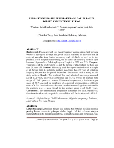 Ketut, Eka Larasati Wardana and Agus, Ari Pratama and Luh, Yenny Armayanti (2023) Persalinan pada ibu berusia kurang dari 20 tahun di RSUD Kabupaten Buleleng. Jurnal Kesehatan Medika Udayana, 9 (1): 8. pp. 87-98. ISSN 2460-9293
