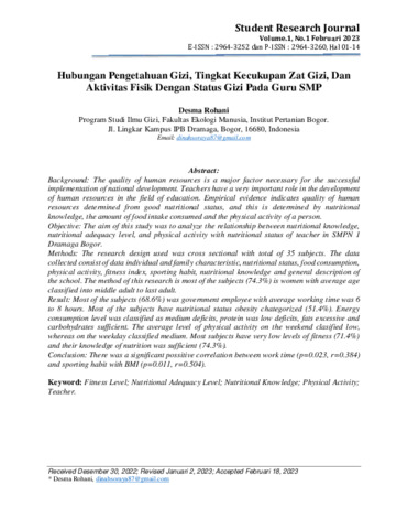 Desma, Rohani (2023) Hubungan pengetahuan gizi, tingkat kecukupan zat gizi, dan aktivitas fisik dengan status gizi pada guru SMP. Student Research Journal, 1 (1): 1. pp. 1-14. ISSN 2964-3260