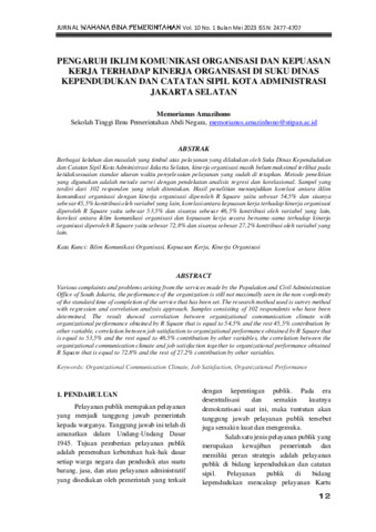 Memorianus Amazihono (2023) Pengaruh iklim komunikasi organisasi dan kepuasan kerja terhadap kinerja organisasi di suku Dinas Kependudukan dan Catatan Sipil Kota Administrasi Jakarta Selatan. Wahana Bina Pemerintahan, 5 (1): 2. pp. 12-26. ISSN 2477-4707