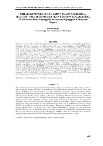 Nasdar, Wijaya (2023) Strategi pengelolaan Badan Usaha Milik Desa (BUMDES) dalam meningkatkan pendapatan asli desa (studi kasus: Desa Bojonggede kecapatan Bojonggede kabupaten Bogor). Wahana Bina Pemerintahan, 5 (1): 4. pp. 42-56. ISSN 2477-4707
