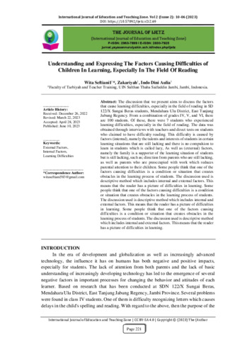 Wita, Seftiani and Zakariyah, Zakariyah and Indo Dini, Aulia (2023) Understanding and expressing the factors causing difficulties of children in learning, especially in the field of reading. International Journal of Education and Teaching Zone, 2 (2): 5. pp. 221-232. ISSN 2963-7899