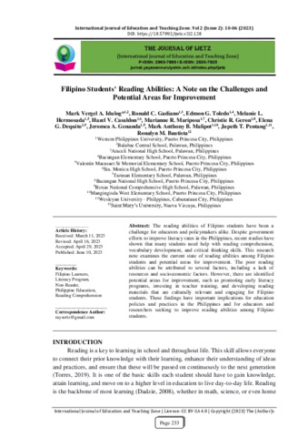 Mark Vergel A., Idulog and Ronald C., Gadiano and Edmon G., Toledo and Melanie L., Hermosada and Hazel V., Casaldon and Marianne R., Mariposa and Christie R., Geron and Elena G., Dequito and Jeromea A., Genanda and Mark Anthony B., Malipot and Jupeth T., Pentang and Ronalyn M., Bautista (2023) Filipino students’ reading abilities: a note on the challenges and potential areas for improvement. International Journal of Education and Teaching Zone, 2 (2): 6. pp. 233-242. ISSN 2963-7899