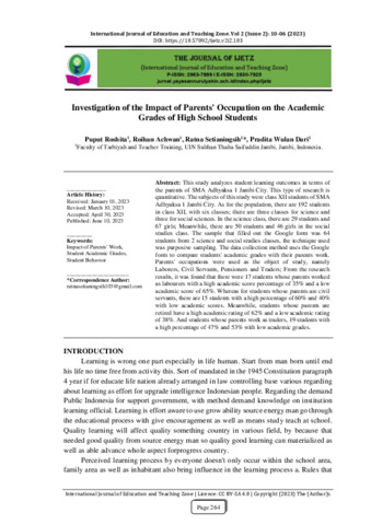 Puput, Roshita and Roihan, Achwan and Ratna, Setianingsih and Pradita Wulan, Dari (2023) Investigation of the impact of parents' occupation on the academic grades of high school students. International Journal of Education and Teaching Zone, 2 (2): 9. pp. 264-274. ISSN 2963-7899