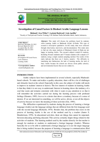 Halimah, Halimah and Irza, Wilita and Laelatul, Badriyah and Lola, Aprillia (2023) Investigation of causal factors is disshort Arabic language lessons. International Journal of Education and Teaching Zone, 2 (2): 12. pp. 299-309. ISSN 2963-7899