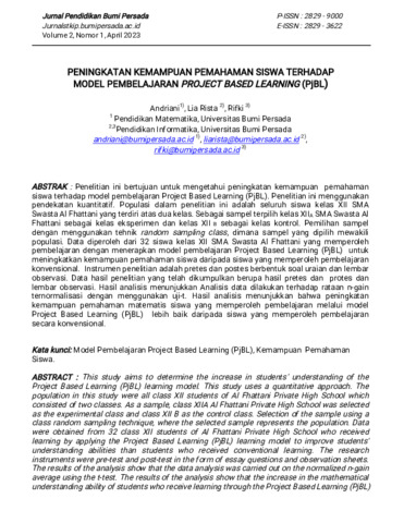 Andriani, Andriani and Lia, Rista and Rifki, Rifki (2023) Peningkatan kemampuan pemahaman siswa terhadap model pembelajaran Project Based Learning (PjBL). Jurnal Pendidikan Bumi Persada, 2 (1): 5. ISSN 2829-9000