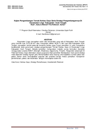 Rusli, Rusli and Askura, Nikmah and Fita, Ridhana and Sufian, Sufian (2021) Kajian pengembangan ternak kerbau gayo serta strategi pengembangannya di Kecamatan Linge Kabupaten Aceh Tengah. Jurnal Ilmu Peternakan dan Veteriner, 3 (2): 2. pp. 9-15. ISSN 2809-8404