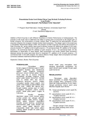 Idham, Noviandi and Fita, Ridhana and Erita, Erita and Nasrullah, Nasrullah (2021) Penambahan enzim sawit dalam pakan yang berbeda terhadap performa ayam broiler. Jurnal Ilmu Peternakan dan Veteriner, 3 (2): 3. pp. 16-22. ISSN 2809-8404