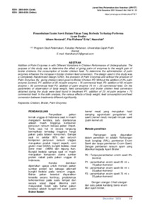 Addition of Palm Enzymes in with Different Variations in Chicken Performance of Undergraduate. The purpose of this study was to determine the effect of giving palm oil enzymes to the weight gain of broiler chickens. the consumption of broiler chicken feed. To determine the administration of palm enzymes influence the increase in broiler chicken feed conversion. The design used in this study was a Completely Randomized Design (CRD), the provision of Palm Enzymes and without the provision of Palm Enzymes. By giving chicken ration given to Broiler Chicken P0: Without the addition of 0% palm enzyme (control), P1: addition of 25 ml palm enzyme + 75 commercial feed, P2: addition of 50 ml palm enzyme + 50 commercial feed P3: addition of palm enzyme 75 ml + 25 commercial feed. On the parameters of observation of body weight, feed consumption and broiler chicken feed conversion obtained during the study were best found in treatment P1: addition of 25 ml palm enzyme + 75 commercial feed. In the sidik analysis, the various effects of body weight, feed consumption and feed conversion between treatments different significantly.