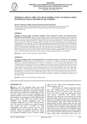 Andriyanti, Wiwien and Prama, H.S and Priyantoro, Dwi (2017) DEPOSISI LAPISAN TIPIS TITANIUM NITRIDA PADA STAINLESS STEEL 316 MENGGUNAKAN METODE DC SPUTTERING. In: PROSIDING PERTEMUAN DAN PRESENTASI ILMIAH PENELITIAN DASAR ILMU PENGETAHUAN DAN TEKNOLOGI NUKLIR, 28 November 2017, Yogyakarta.