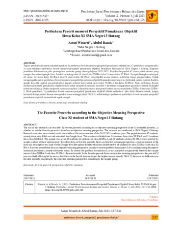 Tujuan penelitian ini untuk mendeskripsikan: 1) peribahasa favorit menurut perspektif pemaknaan objektif atas 13 peribahasa yang tersedia; 2) sama-tidaknya peribahasa favorit menurut perspektif pemaknaan objektif. Penelitian dilakukan di SMA Negeri 3 Sintang. Kegiatan penelitian dilaksanakan pada pertengahan semester genap tahun pelajaran 2022/2023. Populasi berjumlah 47 siswa yakni mereka yang mengisi dan submit google form. Jumlah ini terbagi dari 24 siswa kelas XI IPA-1 dan 23 siswa kelas XI IPA-2. Sampel ditetapkan sebanyak 43 siswa; 22 siswa kelas XI IPA-1 dan 21 siswa kelas XI IPA-2 yang dipilih secara random sederhana tanpa pengembalian. Untuk mengumpulkan data peribahasa favorit menurut perspektif pemaknaan objektif digunakan instrumen tes berbentuk uraian melalui fasilitas google form file upload yang disebarkan kepada seluruh siswa untuk siswa kelas XI IPA-1 dan kelas XI IPA-2. Data peribahasa favorit menurut perspektif pemaknaan objektif yakni untuk menjawab rumusan masalah-1 dianalisis menggunakan prosedur statistik deskriptif yakni mean hitung. Untuk menjawab rumusan masalah-2 dianalisis secara komparatif antara mean sampel kelas XI IPA-1 dan kelas XI IPA-2. Hasil penelitian; 1) peribahasa favorit menurut perspektif pemaknaan objektif adalah peribahasa ‘jika takut dilanda ombak, jangan berumah di tepi pantai’ karena memperoleh mean tertinggi yakni 74,85; 2) tidak terdapat perbedaan peribahasa favorit menurut perspektif pemaknaan objektif menurut kelompok sampel.