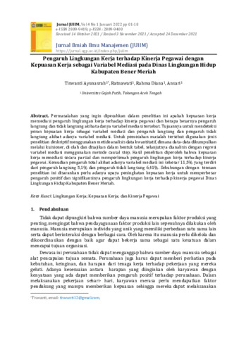 Tiswanti, Ayunasrah and Ratnawati, Ratnawati and Rahma, Diana and Ansari, Ansari (2022) Pengaruh lingkungan kerja terhadap kinerja pegawai dengan kepuasan kerja sebagai variabel mediasi pada Dinas Lingkungan Hidup Kabupaten Bener Meriah. Jurnal Ilmiah Ilmu Manajemen, 4 (1): 1. pp. 1-10. ISSN 2809-9400