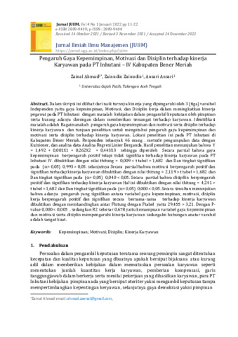 Zainal, Ahmad and Zainudin, Zainudin and Ansari, Ansari (2022) Pengaruh gaya kepemimpinan, motivasi dan disiplin terhadap kinerja karyawan pada PT Inhutani – IV Kabupaten Bener Meriah. Jurnal Ilmiah Ilmu Manajemen, 4 (1): 2. pp. 11-22. ISSN 2809-9400