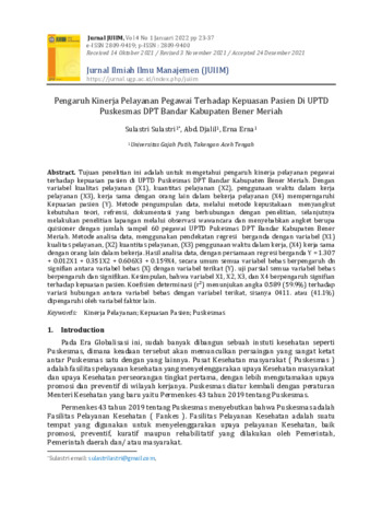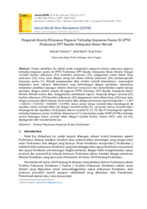 Sulastri, Sulastri and Abd., Djalil and Erna, Erna (2021) Pengaruh kinerja pelayanan pegawai terhadap kepuasan pasien di UPTD Puskesmas DPT Bandar Kabupaten Bener Meriah. Jurnal Ilmiah Ilmu Manajemen, 4 (1): 3. pp. 23-37. ISSN 2809-9400
