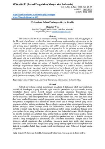 Donatus, Wea (2022) Perkawinan dalam pandangan gereja katolik. Sewagati: Jurnal Pengabdian Masyarakat Indonesia, 1 (2): 4. pp. 25-37. ISSN 2962-4495