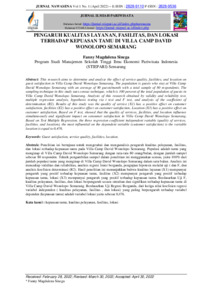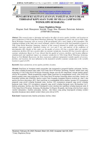 Fanny, Magdalena Sinega and UNSPECIFIED (2022) Pengaruh kualitas layanan, fasilitas, dan lokasi terhadap kepuasan tamu di Villa Camp David Wonolopo Semarang. Nawasena: Jurnal ilmiah Pariwisata, 1 (1): 5. pp. 69-76. ISSN 2828-9536