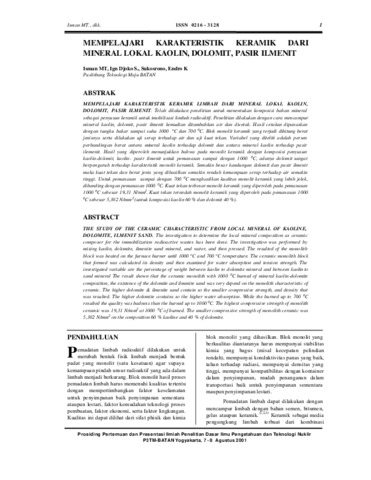 MT, Isman and Sardjono, Ign. Djoko and Sukosrono, Sukosrono and Kismolo, Endro (2001) MEMPELAJARI KARAKTERISTIK KERAMIK DARI MINERAL LOKAL KAOLIN, DOLOMIT, PASIR ILMENIT. In: Prosiding Pertemuan dan Presentasi Ilmiah Penelitian Dasar Ilmu Pengetahuan dan Teknologi Nuklir, 7-8 Agustus 2001, Yogyakarta.