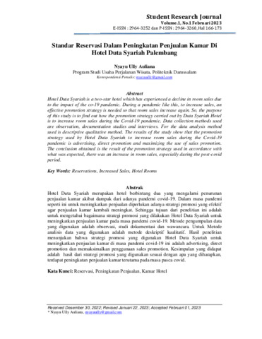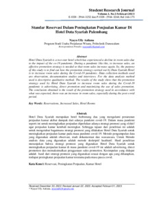 Nyayu, Ully Auliana (2023) Standar reservasi dalam peningkatan penjualan kamar di Hotel Duta Syariah Palembang. Student Research Journal, 1 (1): 14. pp. 166-173. ISSN 2964-3260