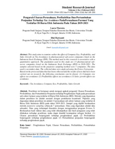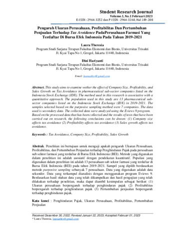 Laura, Theresia and Dini, Hariyanti (2023) Pengaruh ukuran perusahaan, profitabilitas dan pertumbuhan penjualan terhadap tax avoidance pada perusahaan farmasi yang terdaftar di Bursa Efek Indonesia pada Tahun 2019-2021. Student Research Journal, 1 (1): 16. pp. 189-208. ISSN 2964-3260