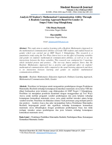 Ulfa, Dinata Damanik and Hasratuddin, Hasratuddin (2023) Analysis of student’s mathematical communication ability through a realistic learning approach based on gender at SMPN 3 Satu Atap Silangkitang. Student Research Journal, 1 (1): 17. pp. 209-224. ISSN 2964-3260