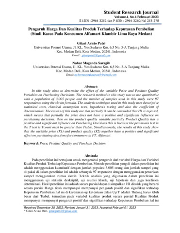Gitari, Aristo Putri and Nahar, Maganda Saragih (2023) Pengaruh harga dan kualitas produk terhadap keputusan pembelian: Studi kasus pada konsumen Alfamart Klambir Lima Raya Medan. Student Research Journal, 1 (1): 21. pp. 253-278. ISSN 2964-3260