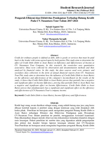 Naisah, Saputri Nst and Nahar, Marganda Saragih (2023) Pengaruh efisiensi dan efektivitas pendapatan terhadap hutang kredit pada CV. Nusantara Tour Tahun 2017-2021. Student Research Journal, 1 (1): 22. pp. 279-302. ISSN 2964-3260