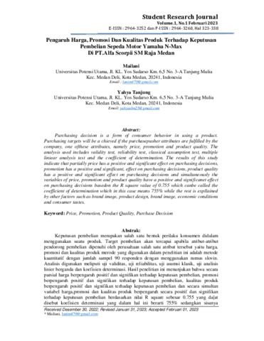 Mailani, Mailani and Yahya, Tanjung (2023) Pengaruh harga, promosi dan kualitas produk terhadap keputusan pembelian sepeda motor Yamaha N-Max di PT. Alfa Scorpii SM Raja Medan. Student Research Journal, 1 (1): 24. pp. 323-338. ISSN 2964-3260