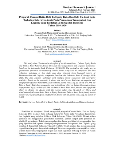 Delima, Delima and Eka, Purnama Sari (2023) Pengaruh current ratio, debt to equity ratio dan debt to asset ratio terhadap return on assets pada perusahaan transportasi dan logistik yang terdaftar di Bursa Efek Indonesia tahun 2016-2020. Student Research Journal, 1 (1): 25. pp. 339-359. ISSN 2964-3260