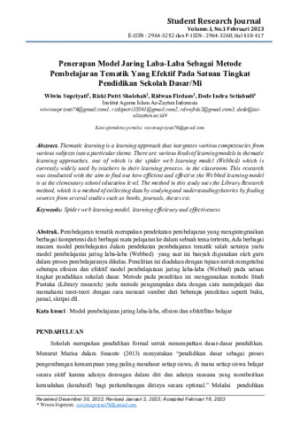 Wiwin, Supriyati and Rizki, Putri Sholehah and Ridwan, Firdaus and Dede, Indra Setiabudi (2023) Penerapan model jaring laba-laba sebagai metode pembelajaran tematik yang efektif pada satuan tingkat pendidikan Sekolah Dasar/Mi. Student Research Journal, 1 (1): 28. pp. 410-417. ISSN 2964-3260