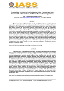 Pengelolaan pasar tradisional berpotensi untuk menciptakan dan memperluas kesempatan kerja, terutama bagi tenaga kerja yang kurang memiliki keterampilan dan keahlian yang memadai untuk bekerja di sektor formal karena tingkat pendidikannya yang rendah, dan sebagai tempat berusaha, pedagang kecil memiliki banyak tempat strategis. nilai-nilai. baik dari segi ekonomi maupun sosial budaya. Tujuan dari penelitian ini adalah untuk mengetahui pengelolaan pasar di Kabupaten Gowa khususnya pasar rakyat Sungguminasa. Metode yang digunakan dalam penelitian ini adalah deskriptif kualitatif. Analisis dalam penelitian ini menggunakan teori yang dikemukakan oleh Henry Fayol dengan dimensi perencanaan, pengorganisasian, pengarahan, pengkoordinasian, dan pengawasan. Hasil penelitian menunjukkan bahwa kurang optimalnya pengawasan dan ketegasan petugas terhadap pemungutan retribusi pasar pada kios dan los, sarana dan prasarana yang kurang memadai, serta kondisi lahan pasar yang sempit mengakibatkan PKL tidak tertampung. Kurangnya tenaga penempatan yang tidak efektif menjadi faktor penghambat dalam proses sosialisasi kepada pedagang. Saran peneliti agar Dinas Perindustrian dan Perdagangan Kabupaten Gowa membenahi pasar secara efektif dan efisien serta meningkatkan optimalisasi pasar, perlu dilakukan langkah-langkah peningkatan kualitas dan kuantitas SDM dan sumber daya pendukung lainnya, agar pedagang ditempatkan di tempat yang sesuai dan diharapkan Dinas Perindustrian dan Perdagangan Kabupaten Gowa lebih memperhatikan fasilitas yang diberikan. ada di sekitar pasar.