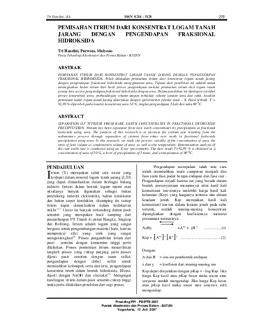 Handini, Tri and Purwoto, Purwoto and Mulyono, Mulyono (2007) PEMISAHAN ITRIUM DARI KONSENTRAT LOGAM TANAH JARANG DENGAN PENGENDAPAN FRAKSIONAL HIDROKSIDA. In: Prosiding PPI - PDIPTN, 10 Juli 2007, Yogyakarta.