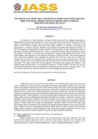 Anne, Abdul Rachman (2022) Pengelolaan arsip surat masuk dan arsip surat keluar pada Biro Umum dan Perlengkapan Sekretariat Daerah Provinsi Sulawesi Selatan. Journal of Administrative and Sosial Science, 3 (1): 6. pp. 67-70. ISSN 2828-6359