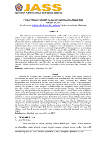 Habibah, Habibah (2022) Pendaftaran peralihan hak atas tanah karena pewarisan. Journal of Administrative and Sosial Science, 3 (1): 8. pp. 85-100. ISSN 2828-6359