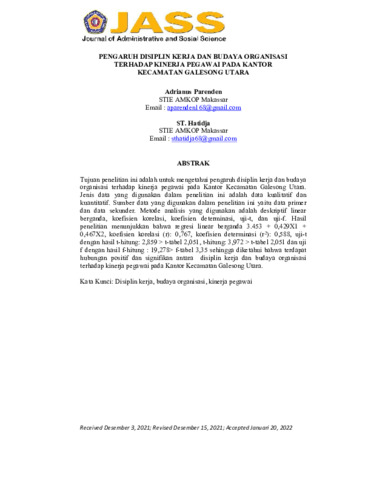 Adrianus, Parenden and ST., Hatidja (2022) Pengaruh disiplin kerja dan budaya organisasi terhadap kinerja pegawai pada Kantor Kecamatan Galesong Utara. Journal of Administrative and Sosial Science, 3 (1): 9. pp. 101-122. ISSN 2828-6359