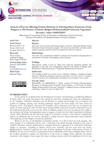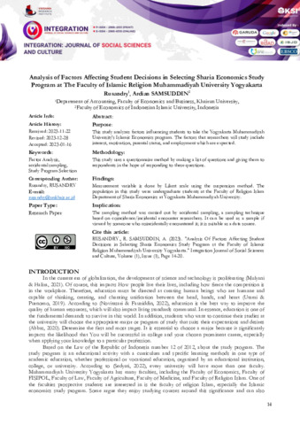 Rusandry, Rusandry and Ardian, Samsuddin (2023) Analysis of factors affecting student decisions in Selecting Sharia Economics Study Program at The Faculty of Islamic Religion Muhammadiyah University Yogyakarta. Integration: Journal of Social Sciences and Culture, 1 (1): 3. pp. 14-20. ISSN 2986-2531