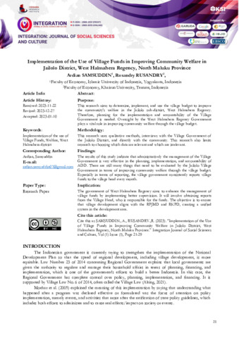 Ardian, Samsuddin and Rusandry, Rusandry (2023) Implementation of the use of village funds in improving community welfare in Jailolo District, West Halmahera Regency, North Maluku Province. Integration: Journal of Social Sciences and Culture, 1 (1): 4. pp. 21-29. ISSN 2986-2531