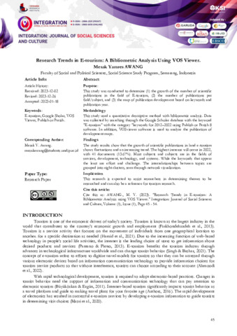 Mesak, Yamres Awang (2023) Research trends in e-tourism: a bibliometric analysis using vos viewer. Integration: Journal of Social Sciences and Culture, 1 (1): 7. pp. 45-54. ISSN 2986-2531