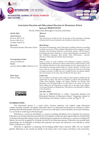 Apriyanti, Widiansyah (2023) Association situation and educational situation in Elementary School. Integration: Journal of Social Sciences and Culture, 1 (1): 8. pp. 55-59. ISSN 2986-2531