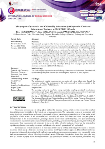 Erry, Hendriawan and Rina, Marlina and Ernandia, Pandikar and Edy, Sofyan (2023) The impact of pancasila and citizenship education (PPKn) on the character education of students at SMK PGRI 1 Cimahi. Integration: Journal of Social Sciences and Culture, 1 (1): 9. pp. 60-67. ISSN 2986-2531