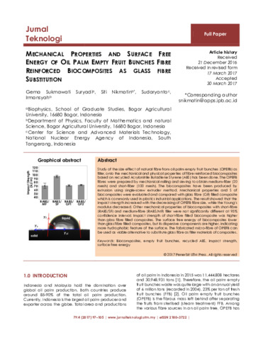 Suryadi, Gema Sukmawati and Nikmatin, Siti and Sudaryanto, Sudaryanto and Irmansyah, Irmansyah (2017) MECHANICAL PROPERTIES AND SURFACE FREE ENERGY OF OIL PALM EMPTY FRUIT BUNCHES FIBRE REINFORCED BIOCOMPOSITES AS GLASS FIBRE SUBSTITUTION. Jurnal Teknologi, 79. pp. 97-105. ISSN 2180–3722