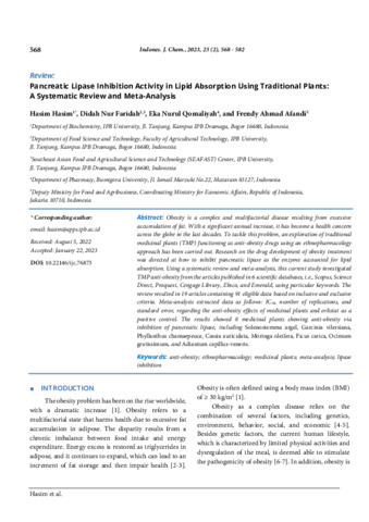 Hasim, Hasim and Didah, Nur Faridah and Eka, Nurul Qomaliyah and Frendy, Ahmad Afandi (2023) Pancreatic lipase inhibition activity in lipid absorption using traditional plants a systematic review and meta-analysis. Indonesian Journal of Chemistry, 23 (2): 24. pp. 568-582. ISSN 1411-9420