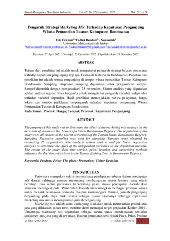 Feti, Fatimah and Fadhol, Ibrahim and Nursaidah, Nursaidah (2022) Pengaruh strategi marketing mix terhadap keputusan pengunjung wisata Pemandian Tasnan Kabupaten Bondowoso. Jurnal Manajemen Dan Bisnis Indonesia, 8 (2): 4. pp. 171-179. ISSN 2460-9471