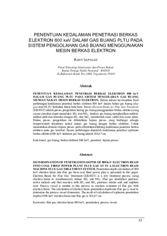 PENENTUAN KEDALAMAN PENETRASI BERKAS ELEKTRON 800 keV DALAM GAS BUANG PLTU PADA SISTEM PENGOLAHAN GAS BUANG MENGGUNAKAN MESIN BERKAS ELEKTRON. Dalam tulisan ini disajikan hasil perhitungan kedalaman penetrasi berkas elektron 800 keV dalam bahan gas buang (flue gas) dari PLTU berbahan bakar batu bara. Proses Electron Beam for Flue Gas Treatment (EB-FGT) adalah proses pengolahan kering gas buang menggunakan berkas elektron yang secara simultan dapat mereduksi SO2 dan NOx. Iradiasi gas buang menghasilkan radikal- radikal aktif dan bereaksi dengan SO2 dan NOx membentuk asam sulfat dan asam nitrat. Dalam proses pengolahan ini dibutuhkan bejana proses yang berfungsi sebagai tempat/wadah terjadinya reaksi antara gas buang dengan berkas elektron. Untuk menentukan dimensi bejana proses perlu ditentukan/dihitung kedalaman penetrasi berkas elektron pada gas tersebut. Secara perhitungan diperoleh kedalaman penetrasi optimum berkas elektron 800 keV kedalam gas buang adalah 188,67 cm.