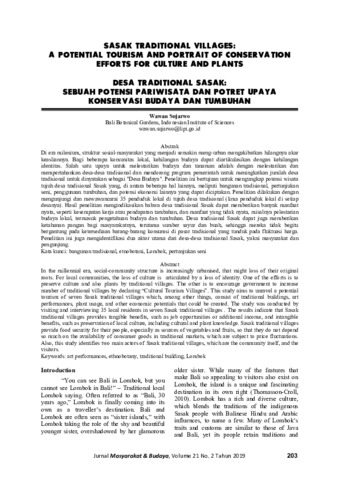 Wawan, Sujarwo (2019) Sasak traditional villages: a tourism potential and conservation effort for culture and plants. Jurnal Masyarakat dan Budaya, 21 (2). p. 203. ISSN 2502-1966