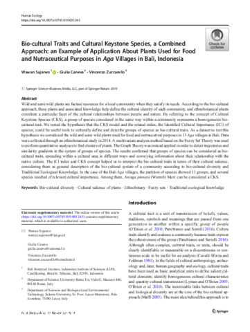 Wawan, Sujarwo and Giulia, Caneva and Vincenzo, Zuccarello Bio-cultural traits and cultural keystone species, a combined approach: an example of application about plants used for food and nutraceutical purposes in Aga Villages in Bali, Indonesia. Human Ecology, 47. pp. 917-929. ISSN 1572-9915
