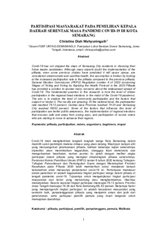 Christine, Diah Wahyuningsih (2021) Partisipasi masyarakat pada pemilihan kepala daerah serentak masa pandemi Covid-19 di Kota Semarang. Public Service and Governance Journal, 2 (1): 6. pp. 58-66. ISSN 2963-7252